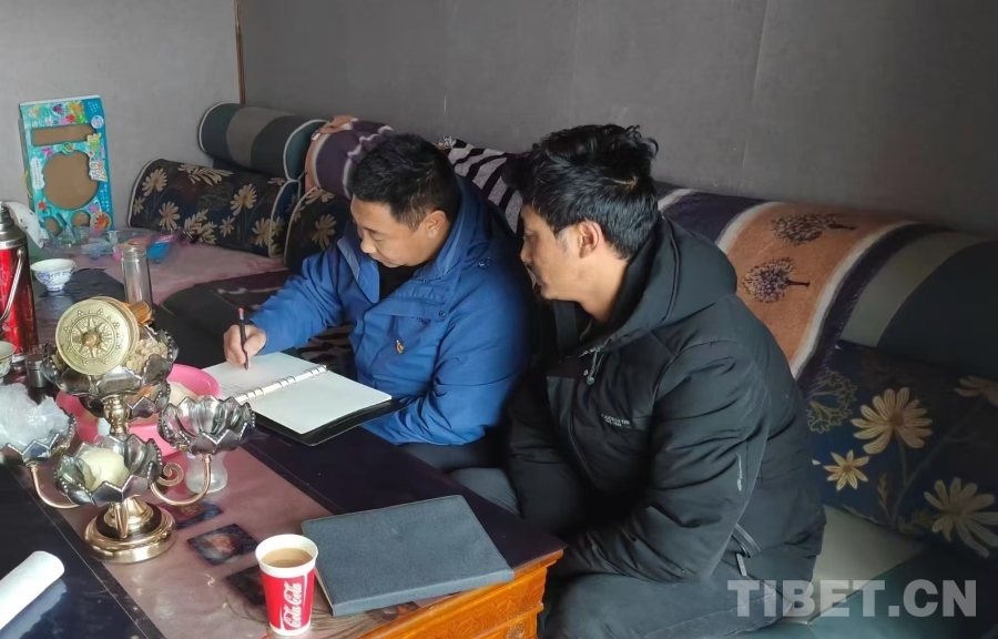 圖為老沙開周(左)在當(dāng)曲村管護員家中了解相關(guān)工作