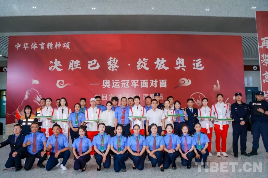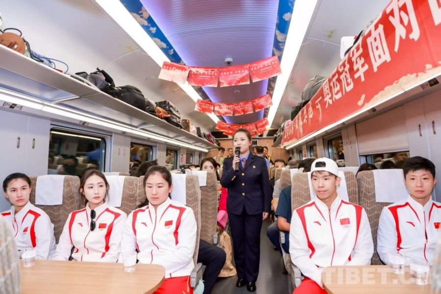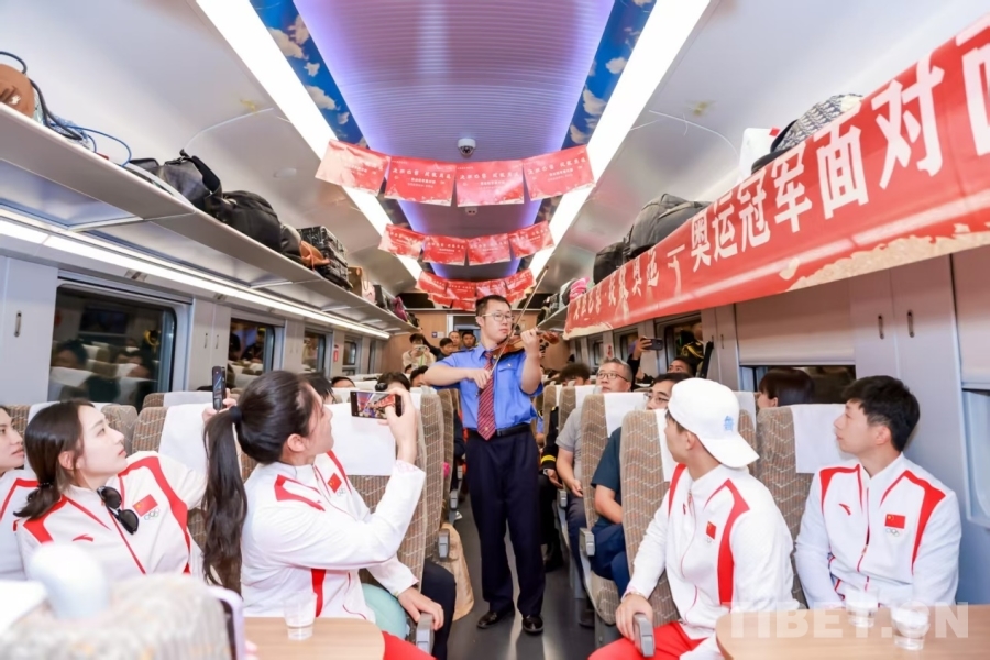 圖為奧運(yùn)冠軍走進(jìn)林芝火車(chē)站