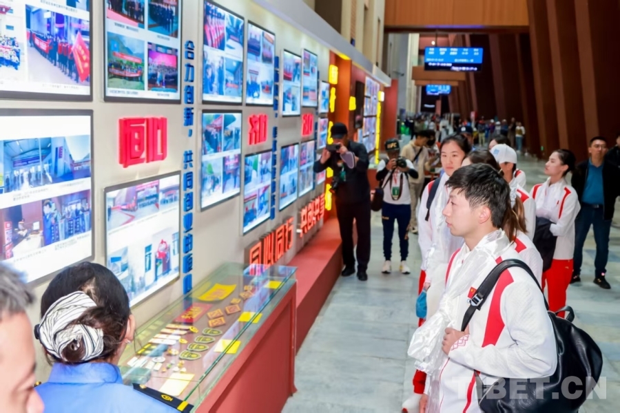 圖為奧運(yùn)冠軍們參觀青藏鐵路精神文化長(zhǎng)廊