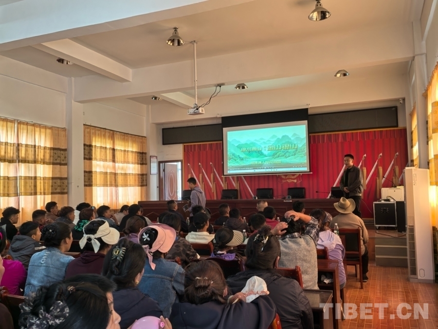 圖為群眾觀看藏語配音的環(huán)保宣傳片《大自然在說話》