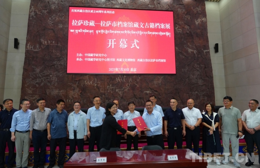 本次展覽由中國藏學研究中心主辦,中國藏學研究中心圖書館、西藏文化博物館和西藏自治區(qū)拉薩市檔案館共同承辦。開幕式上,中國藏學研究中心圖書館與拉薩市檔案館簽署《藏文古籍檔案文獻數(shù)據(jù)共享與開發(fā)利用合作協(xié)議》。(中國西藏網(wǎng) 記者/周晶)