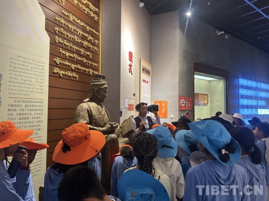 圖為雪豹隊(duì)隊(duì)長洛桑平措在展廳為營員們講解藏文的起源歷史