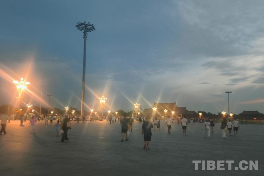 暑期的天安門廣場更加熱鬧,不僅有一家老幼同游的家庭,有旅行社帶來的各地旅游團,最多的是各種學校、團體組織的大大小小的學生團,他們身著不同顏色款式的服裝,共同等待著激動人心的時刻?!吧胶油}·京華筑夢”研學團的少年們便是其中一員,他們穿著淺藍色的T恤,戴著白色的棒球帽,散發(fā)著西藏少年的朝氣。