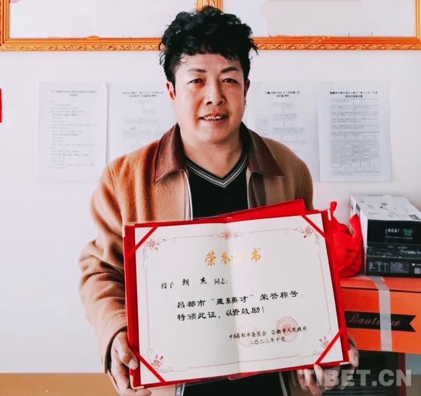 圖為朗杰被授予昌都市“藏東英才”榮譽稱號