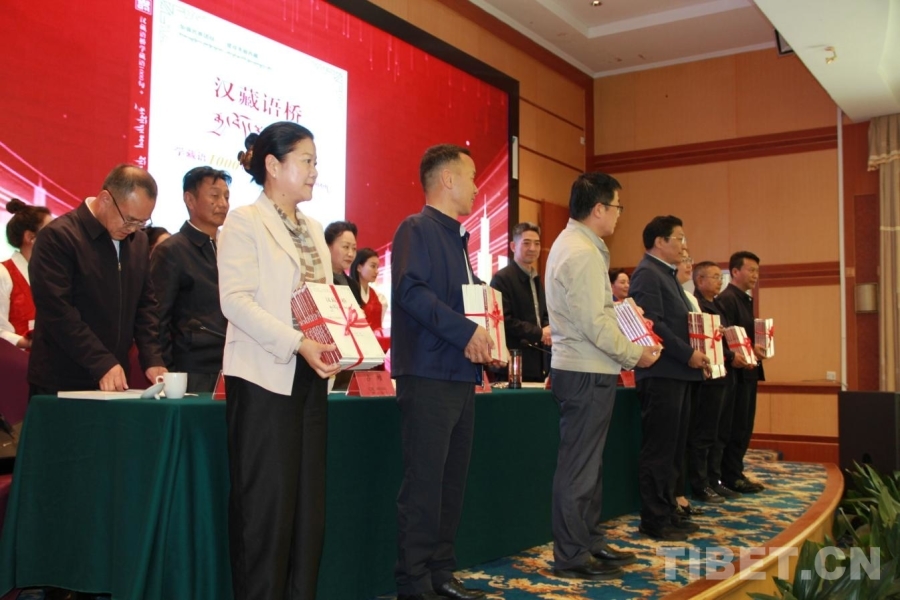 中國西藏網(wǎng)訊 在喜迎西藏自治區(qū)成立60周年之際,8月13日,《漢藏語橋:學藏語1000句+》新書發(fā)布會暨贈書儀式在拉薩舉行。活動現(xiàn)場,西藏自治區(qū)政府副主席、自治區(qū)藏語委副主任甲熱·洛桑丹增等向自治區(qū)藏語委成員單位、相關(guān)單位及街道、社區(qū)、村居代表贈送《漢藏語橋:學藏語1000句+》570冊。