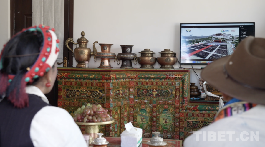 圖為邊巴與家人在災(zāi)后重建新居中觀看西藏自治區(qū)成立60周年慶祝大會(huì) 定日縣融媒體中心供圖
