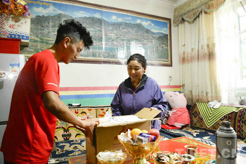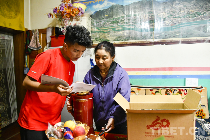 圖為卓嘎與兒子羅布次仁一起鄭重打開中央代表團(tuán)贈(zèng)送的全自動(dòng)酥油茶壺包裝 攝影:趙振宇