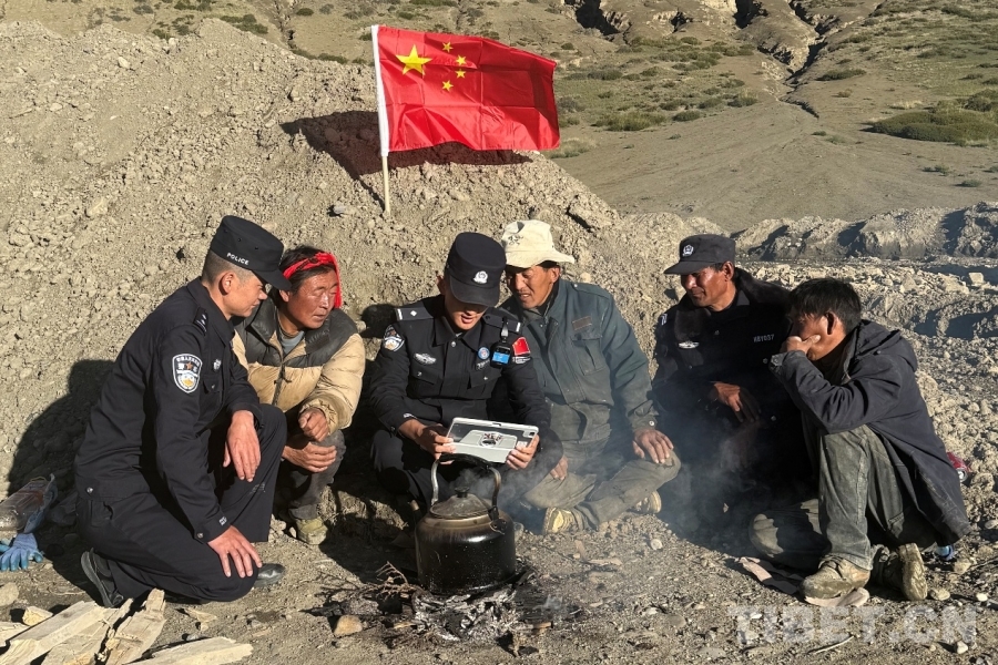 圖為日喀則邊境管理支隊(duì)薩嘎邊境管理大隊(duì)昌果邊境派出所民警在海拔5300米的拉孜加久山口巡邏間隙與護(hù)邊員共同收看紀(jì)念中國人民抗日戰(zhàn)爭暨世界反法西斯戰(zhàn)爭勝利80周年大會 攝影:旦增扎巴