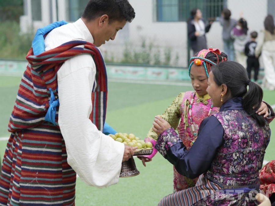 大家圍坐交流,家長們細(xì)致講述藏裝配飾的象征意義,孩子們認(rèn)真聽著縣群團(tuán)工作部老師講述節(jié)日傳說。在服飾走秀環(huán)節(jié),藏族少女白瑪央吉牽著妹妹的手款款走來,盡顯藏族服飾的華美與端莊;鍋莊舞表演時(shí),人們手拉手,舞步踏響同一節(jié)奏。品嘗特色美食時(shí),亞東李子、奶渣、鮭魚罐頭等特色美食登臺亮相。支教團(tuán)成員與家長化身“美食代言人”,盡情分享美食,樂在其中。