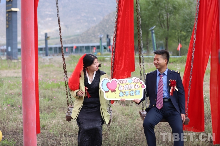 在全場(chǎng)來賓的祝福中,兩對(duì)身穿鐵路制服和民族服飾的新人成為本次集體婚禮的耀眼主角,在現(xiàn)場(chǎng)同事的見證下,在拉薩地區(qū)特有的藏戲祝福聲中,完成了一場(chǎng)終生難忘的儀式。新人王克龍與武春燕并肩坐在秋千上,目光緊緊相依;愛情長(zhǎng)廊中,另一對(duì)新人張慶強(qiáng)與蔡雨欣共同掛上同心鎖。