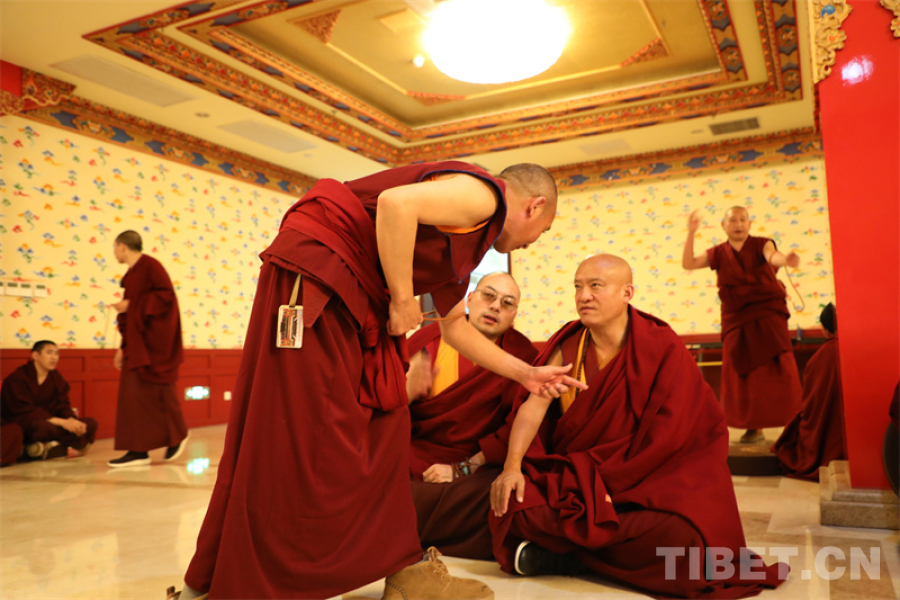 圖為西藏佛學(xué)院學(xué)員與中國藏語系高級佛學(xué)院學(xué)員辯經(jīng)交流 攝影:王茜