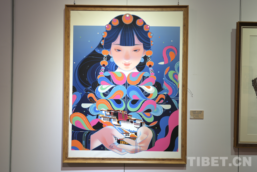 展覽現(xiàn)場,參展藝術(shù)家李旻的作品《虹光圣城》色彩絢麗,構(gòu)思新穎,引得眾多觀眾駐足觀看。據(jù)介紹,本幅作品是一副綜合運(yùn)用了現(xiàn)代藝術(shù)創(chuàng)作手段的數(shù)字繪畫,同時融入了如布達(dá)拉宮、藏裝等經(jīng)典的藏式元素,畫面生動,色彩鮮艷,形式新穎,展現(xiàn)了當(dāng)代西藏藝術(shù)的傳承與創(chuàng)新,是本次展覽極具代表性的作品之一。
