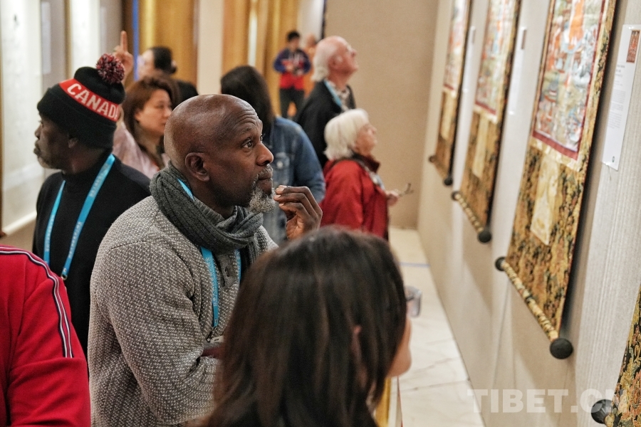 圖為展覽現(xiàn)場(chǎng)觀眾感受唐卡的細(xì)節(jié)