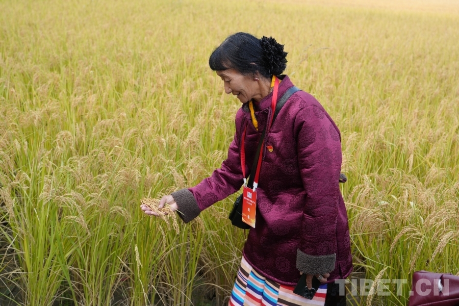 圖為西藏基層干部學習參觀團成員央青反復摩挲著沉甸甸的稻谷 攝影:王茜