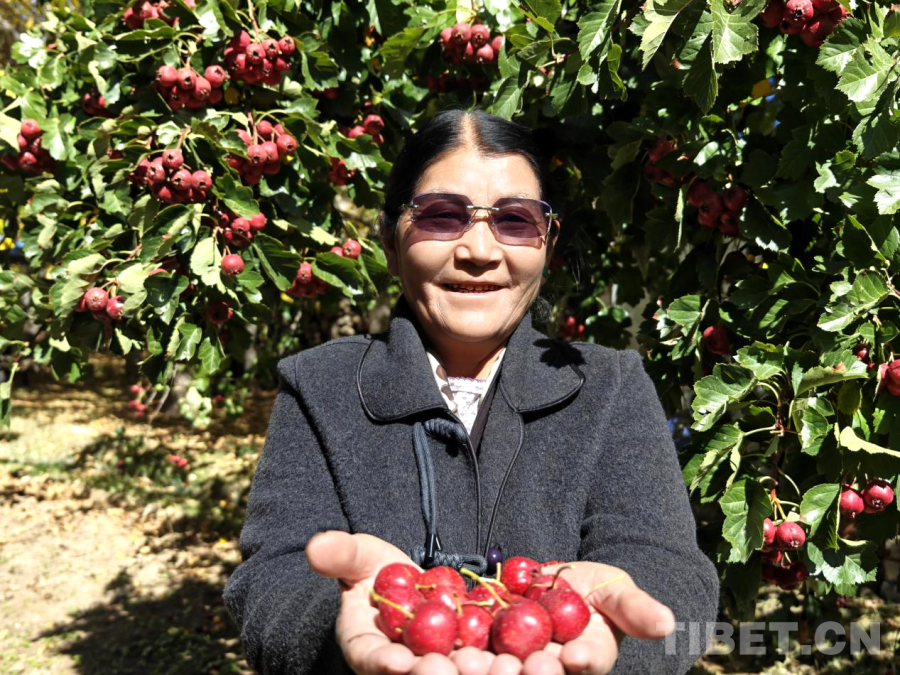 圖為次仁措姆在自家院落中展示自種的山楂