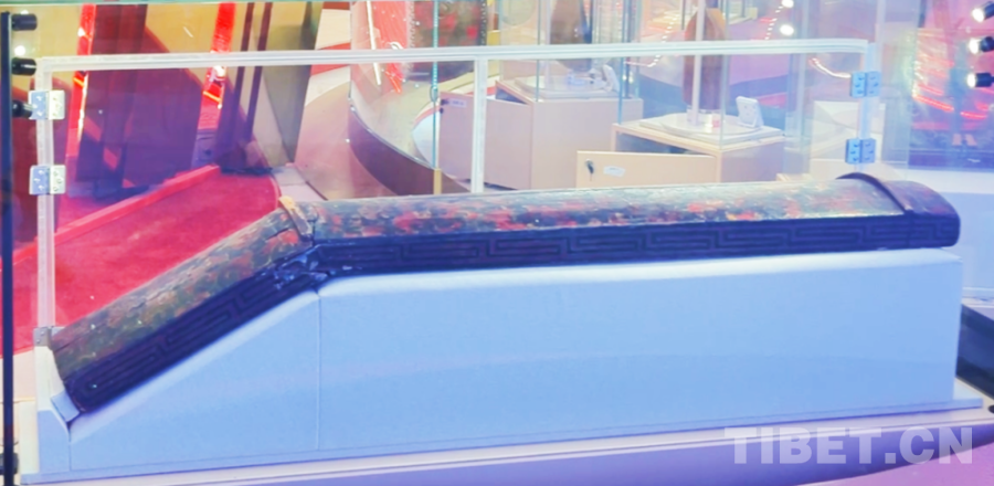 我們看到,雖然歷經(jīng)千年,琴與長鼓仍色澤鮮艷,保存完好。整體呈亞腰形,兩端配備皮帶,可系于腰間,長鼓中間最細(xì)窄之處可系繩便于安置在樂器架上。其表面精巧地髹飾著朱漆與黑漆,巧妙地描繪出寶相牡丹花、云頭紋和火焰紋。而擁有同樣花紋的木琴一端斜下折出鈍角,更見巧思。雖然木琴兩道岳山間原本的琴弦因年代久遠(yuǎn)沒有了,但我們?nèi)苑路鹉芟胂蟮?,入藏后的演奏中,琴弦聲聲,有長安的溫婉綿長,也含雪域的雄渾遼闊,鼓聲陣陣,中原的節(jié)奏與雪域的韻律交織,和鳴穿越時空,在當(dāng)下奏出和諧樂章。這兩件公主的嫁妝,早已不是單純的器物,更承載著深厚的歷史文化底蘊,成為民族文化交融的鮮活注腳。