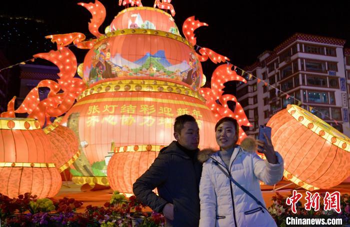 康定街頭民眾在彩燈組前合影留念。劉忠俊 攝