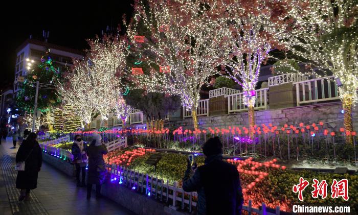 1月16日,新春將至,四川甘孜康定市街頭大型迎春彩燈、霓虹燈投用,夜幕下絢爛的光影吸引了不少民眾目光。