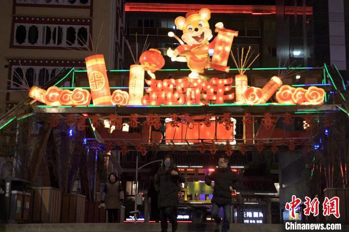 康定街頭民眾從“鼠年”彩燈組下穿過(guò)。劉忠俊 攝