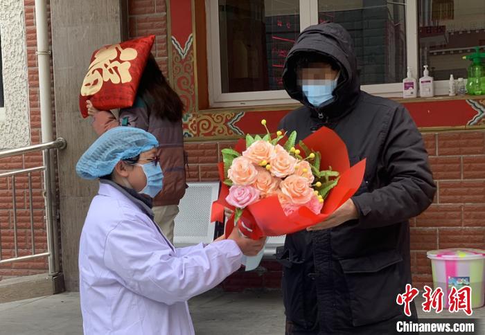醫(yī)護人員向走出隔離病區(qū)的降某送上鮮花。 劉忠俊 攝