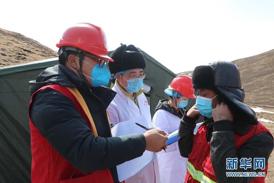 青海-河南±800千伏特高壓工程青2標(biāo)進(jìn)行復(fù)工后人員測(cè)溫、防護(hù)用品發(fā)放。新華網(wǎng) 鄒建華 攝