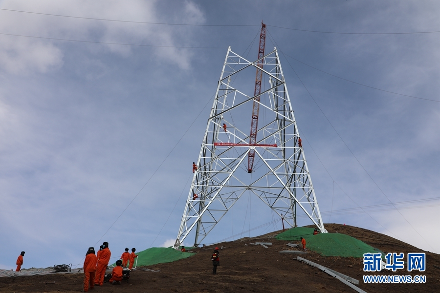 青海-河南±800千伏特高壓工程青2標(biāo)復(fù)工現(xiàn)場(chǎng),施工人員進(jìn)行組塔作業(yè)。新華網(wǎng) 鄒建華 攝