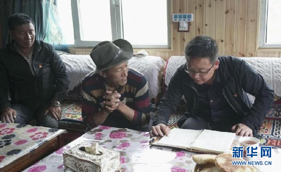 青海省玉樹藏族自治州囊謙縣覺拉鄉(xiāng)尕少村第一書記麻成學(右)在農牧民家中走訪(2019年8月30日攝)。新華社記者 李亞光 攝