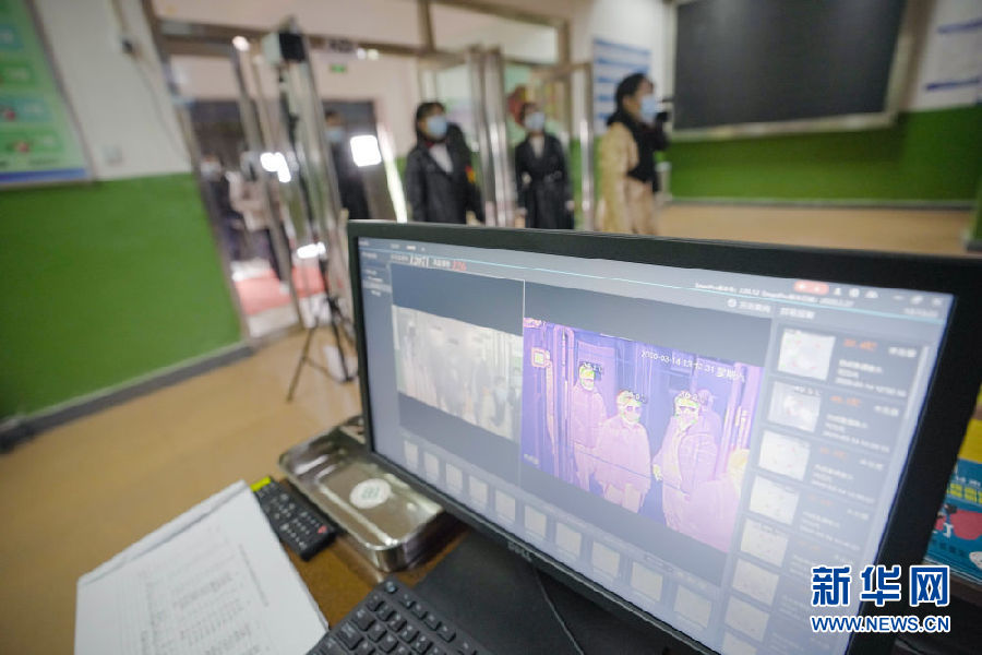 3月14日,在海北州第一高級(jí)中學(xué)教學(xué)樓入口處,學(xué)生在依次通過(guò)體溫監(jiān)控儀。新華社 吳剛 攝