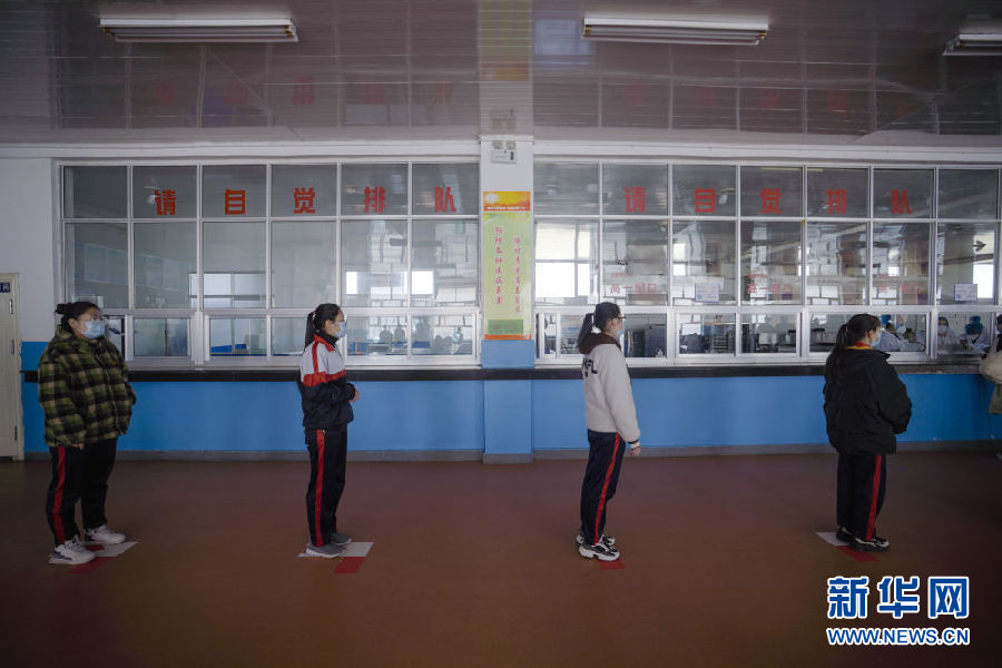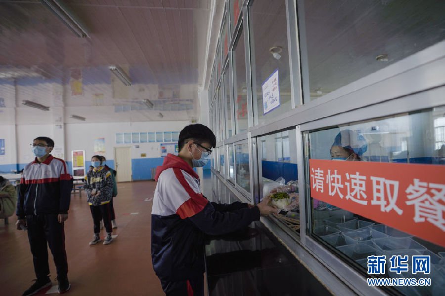 3月14日,海北州第一高級(jí)中學(xué)學(xué)生正在餐廳排隊(duì)取餐。新華社 吳剛 攝