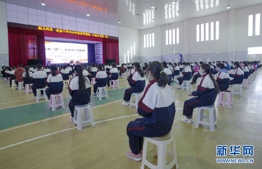 3月14日,海北州第一高級(jí)中學(xué)高一年級(jí)學(xué)生在體育館內(nèi)進(jìn)行防疫健康教育開學(xué)第一課。新華社 吳剛 攝