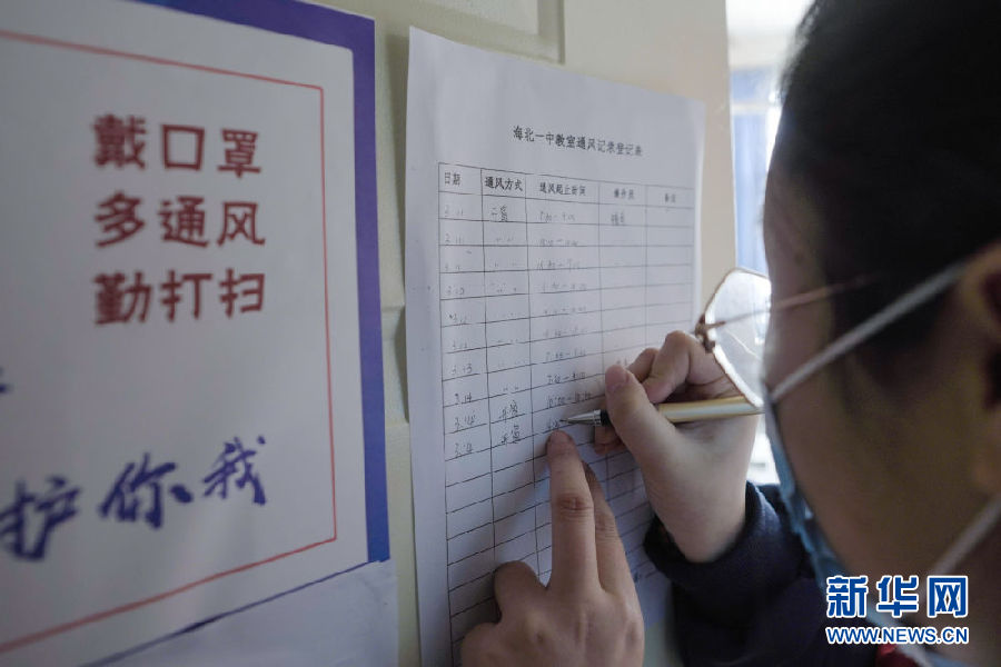 3月14日,海北州第一高級(jí)中學(xué)學(xué)生柳逢靈在記錄教室通風(fēng)情況。新華社 吳剛 攝