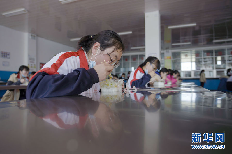 3月14日,海北州第一高級(jí)中學(xué)的學(xué)生正在餐廳分桌就餐。新華社 吳剛 攝