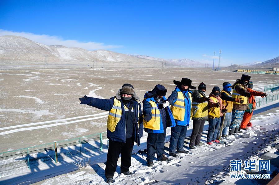 1月11日,在青藏鐵路望昆站附近,于本蕃(左一)和工友們在施工前進(jìn)行安全檢查。新華社記者 張龍 攝