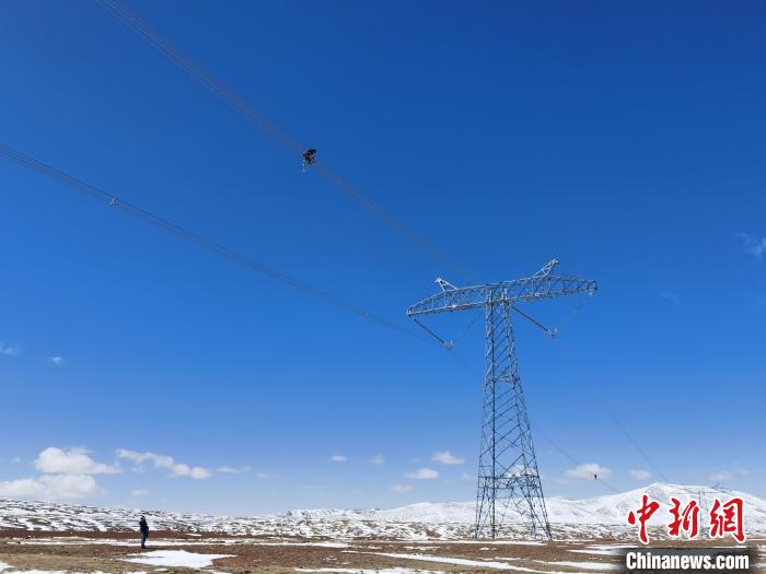 圖為5月13日,國網(wǎng)青海檢修公司輸電運(yùn)檢人員在海拔五千米的風(fēng)火山地區(qū)對“電力天路”±400千伏柴拉直流線路進(jìn)行空中走線巡檢,查找并消除線路缺陷。謝莉蓉 攝