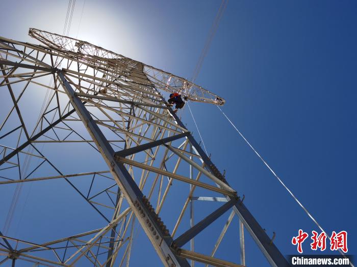 5月17日,在海拔4700多米的五道梁地區(qū),在“電力天路”±400千伏柴拉線636號塔上,3名作業(yè)人員正在更換絕緣子串,塔下6名作業(yè)人員在全力配合,工作負責人馬興義正仰頭觀察著塔上的一舉一動,時不時提醒工作注意事項。