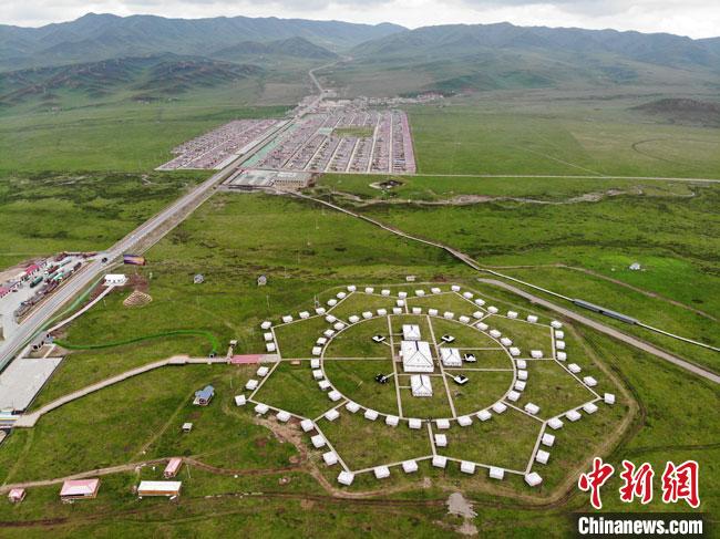 尕秀村的帳篷城由108頂大小各異的藏式風(fēng)格帳篷組成??罩懈╊?,一頂頂帳篷如同一顆顆璀璨的珍珠,點綴著曬銀灘草原的秀美。楊艷敏 攝