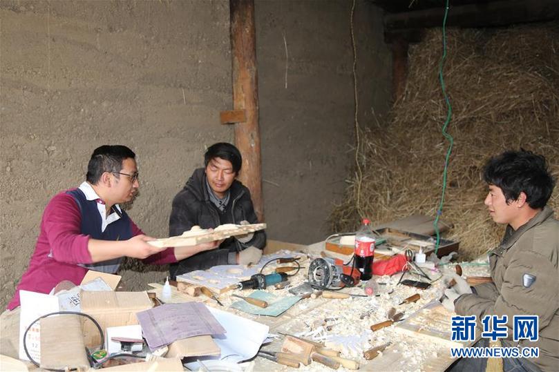 扎西才讓(左)與村里的木匠探討木工產(chǎn)業(yè)發(fā)展(4月4日攝)。東宮村即將招募村內愿意學習木工的青年,開辦木工培訓班,讓更多人掌握一門手藝。新華社發(fā)(張顥 攝)