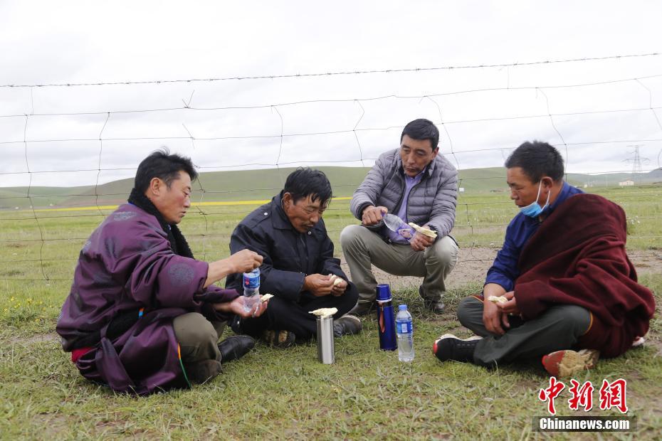 7月21日,青海省海北藏族自治州剛察縣伊克烏蘭鄉(xiāng)剛察貢麻村的索南木旦巴(左一)、仁增才讓(左二)、吉科加(右二)、萬瑪扎西(右一)四人在撿拾著草場垃圾途中,吃餅子,喝礦泉水充饑。2008年,萬瑪扎西路在村支書的支持下,與索南木旦巴、仁增才讓、吉科加三個人組建了義務(wù)環(huán)保隊,自此一干就是12年。他們在撿拾垃圾的同時進(jìn)行著環(huán)保宣傳,希望從源頭減少垃圾。仁增才讓說:“現(xiàn)在草原上的垃圾幾乎是看不到了?!敝行律缬浾?馬銘言 攝