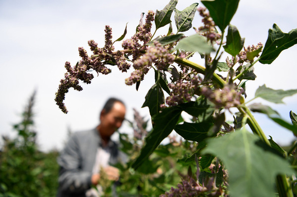 8月2日,天祝藏族自治縣松山鎮(zhèn)大溝興農(nóng)種養(yǎng)殖專業(yè)合作社負責人文玉廷在地里查看藜麥生長情況。陳斌 攝