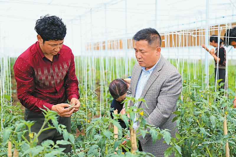 王偉(右)向旦真貢傳授番茄種植技術(shù)。 周琳 攝