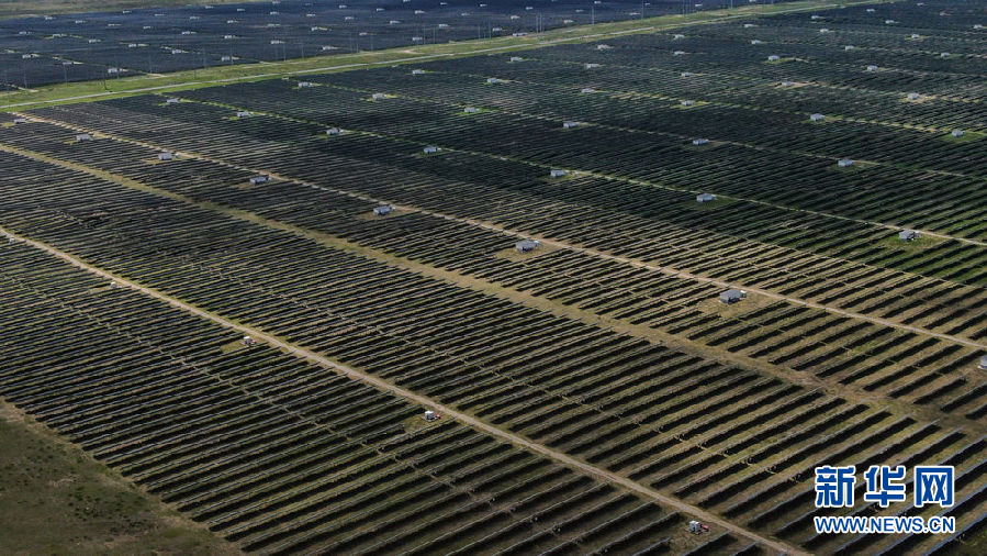 這是8月17日在青海省海南藏族自治州共和縣塔拉灘綠色產(chǎn)業(yè)發(fā)展園區(qū)拍攝的光伏電站(無(wú)人機(jī)照片)。新華社記者 張龍 攝