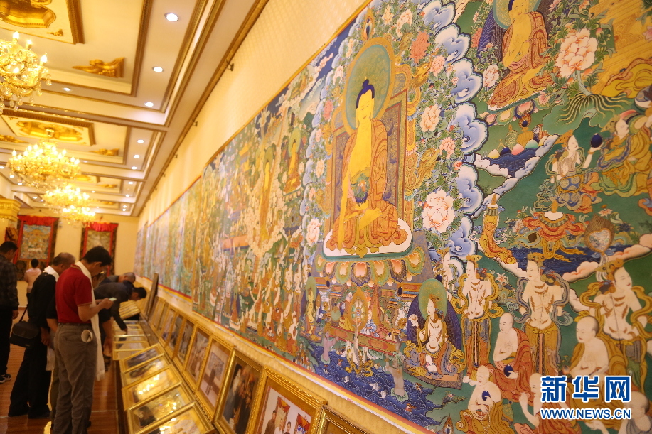 在龍樹花苑的展示大廳,游客正在觀賞展出的唐卡作品。新華網(wǎng) 卡婭梅朵攝