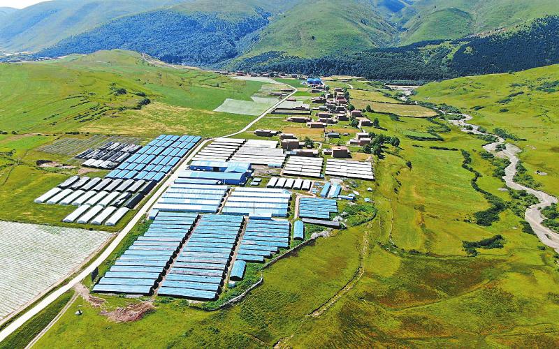 8月19日航拍的阿壩縣高原中低溫食用菌基地。該基地年創(chuàng)產(chǎn)值達2500余萬元,常年解決貧困農(nóng)牧民就業(yè)200余人。肖雨楊 攝
