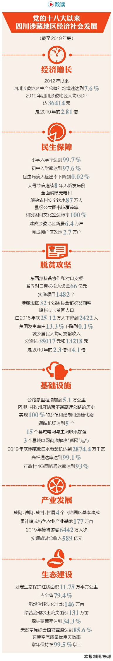 省委涉藏辦相關(guān)負(fù)責(zé)人告訴記者,近年來四川省涉藏地區(qū)加快發(fā)展特色優(yōu)勢產(chǎn)業(yè),推動全域旅游、高原農(nóng)牧業(yè)、清潔能源、民族手工藝等提質(zhì)增效。依托大熊貓、大九寨、大香格里拉、大草原等特色資源,涉藏地區(qū)大力發(fā)展全域旅游,“凈土阿壩”“圣潔甘孜”“大涼山”品牌影響力不斷提升,阿壩州、甘孜州成功創(chuàng)建首批國家級全域旅游示范區(qū),2019年接待游客6442萬人次、實現(xiàn)旅游總收入589億元。涉藏地區(qū)重點發(fā)展高原牦牛、特色果蔬、釀酒葡萄、優(yōu)質(zhì)青稞、道地中藏羌藥材、野生食用菌等產(chǎn)業(yè),基本建成成阿、德阿、成甘、甘眉4個飛地園區(qū);大力推進清潔能源建設(shè),水電裝機容量達到2875.6萬千瓦。截至2019年底,四川涉藏地區(qū)人均GDP達到36414元,是2010年的2.81倍;城鄉(xiāng)居民人均可支配收入分別達到35017元、13218元,接近全省平均水平,向2020年底實現(xiàn)全面同步小康邁出了堅實一步。