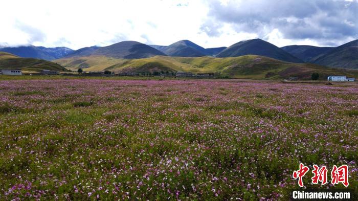 稻城縣噶通鎮(zhèn)八美村位于亞丁機場前往亞丁景區(qū)的交通要道上。長期以來,這片草原沙化現象日益嚴重,當地村民賴以生存的傳統(tǒng)放牧都難以為繼。2016年以來,稻城縣利用生態(tài)治理工程實施的契機,整合全域旅游和脫貧攻堅等涉農涉旅資金,在沙化草原上大面積種植格桑花,將1599畝沙化草地打造成色拉花海。