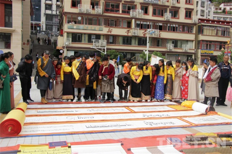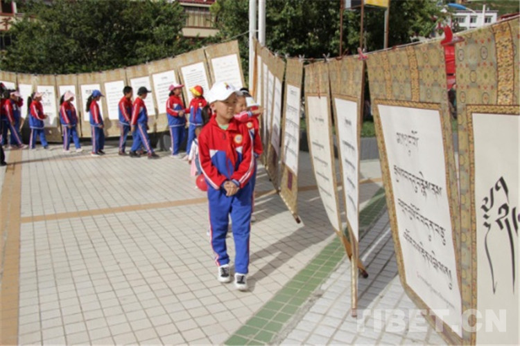中國西藏網訊 9月25日,四川省甘孜藏族自治州得榮縣“喜迎建州70周年?首屆藏文書法展覽活動”開幕。書法愛好者、農牧民群眾、中小學生、僧尼等近1000余人在書法長卷、古籍前駐足學習、拍照。