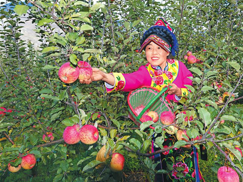 產(chǎn)業(yè)扶貧讓佳山村百姓過(guò)上了幸福生活。圖為佳山村村民正在摘蘋果。