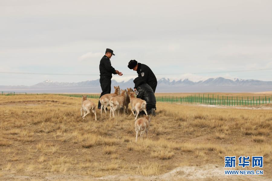 12月7日,可可西里巡山隊員和藏羚羊幼仔在一起。新華社記者 王艷 攝