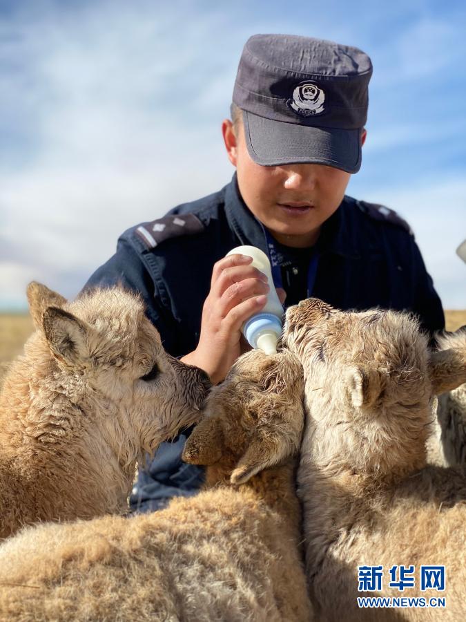 可可西里巡山隊員鄧海平給藏羚羊幼仔喂奶(12月6日攝)。新華社記者 藍翔 攝