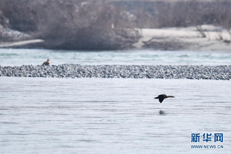 12月11日,一只赤麻鴨在千姿湖濕地公園飛翔。新華社記者 吳剛 攝